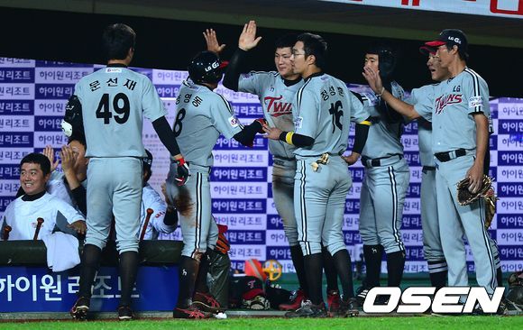 7회초 LG 공격 2사 2, 3루 상황 5번 이진영의 역전 2타점 좌전 안타 때 2루 주자 양영동이 홈까지 내달려 세이프 된 뒤 더그아웃 동료들과 인사를 나누고 있다.