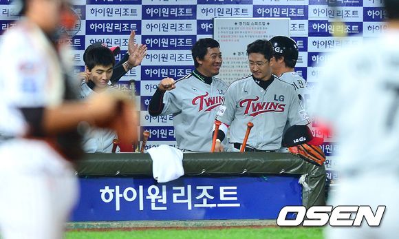 7회초 LG 공격 2사 2, 3루 상황 5번 이진영이 역전 2타점 좌전 안타를 날린 뒤 대주자 문선재와 교체됐다. 더그아웃으로 들어와 이병규 등과 인사를 나누고 있는 이진영.