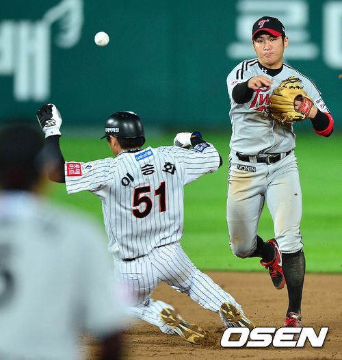 7회말 롯데 공격 2사 1루 상황 2번 정훈의 내야 땅볼 때 LG 유격수 오지환이 주자 이승화를 포스아웃 시킨 뒤 1루로 송구하고 있다.
