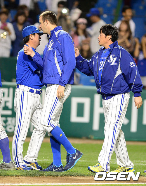 경기후 삼성 류중일 감독이 밴덴헐크, 진갑용과 승리 하이파이브를 하고 있다. /jpnews@osen.co.kr