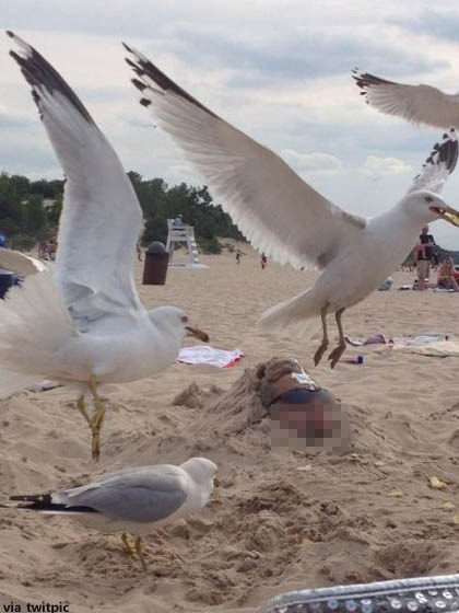 사진은 해변에서 멋진 선글라스를 끼고 얼굴만 드러낸 채 모래찜질을 하는 한 남성의 얼굴에 갈매기가 분뇨 테러를 한 모습이 담겨있다. '가장 불운한 남자'는 모래 속에 묻혀 꼼짝 못하고 갈매기의 만행을 당하고 말았다.