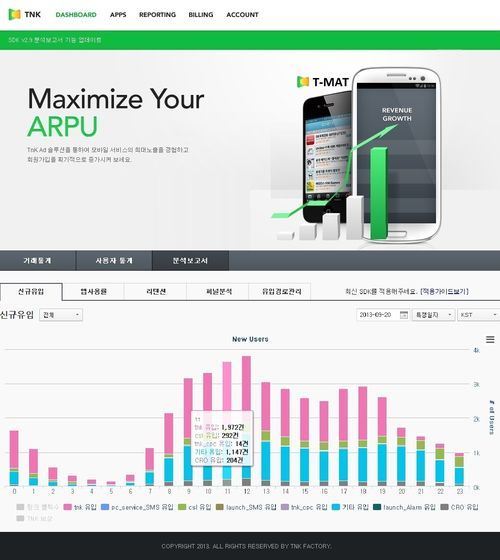 TNK팩토리가 오픈한 T-MAT(TNK Mobile Application Analytics & Tracking Service)는 모바일어플리케이션 개발사나 운영자가 가장 효율적으로 모바일 서비스를 확산시키고 운영할 수 있도록 각종 분석자료를 제공하는 솔루션이다.