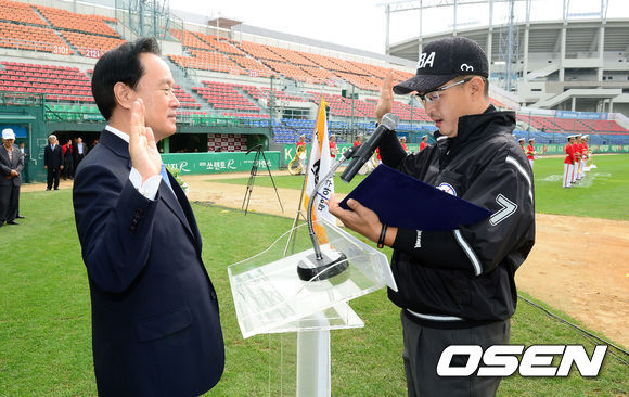 김도형 심판위원이 대한야구협회 이병석 회장에 심판 선서를 하고 있다.