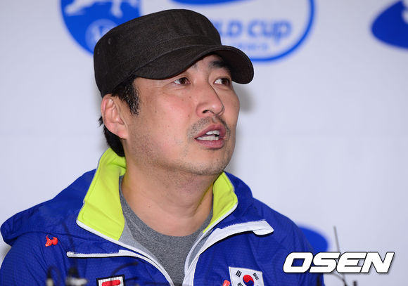대표팀 윤재명 감독이 취재진의 질문에 답변하고 있다.