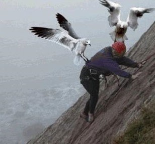 '가장 불운한 남자 2탄' 속 사진에는 한 남성이 바닷가 암벽을 등반하고 있는 가운데 갈매기로 보이는 새 두 마리가 남성을 발로 잡는 등 공격하고 있다. 위험하게 암벽 등반을 하고 있는 남성은 손을 쓰지도 못해 갈매기의 공격을 막을 수도 없는 상황이다.