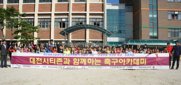 국민체육진흥공단과 스포츠토토의 지원으로 열린 '대전 시티즌과 함께하는 축구아카데미' 행사는 스포츠로 건강한 학교를 만들기 위한 학교 스포츠 보급 프로그램의 하나로, 앞으로 당진시 면천초등학교, 홍성군 홍동초등학교, 예산군 예산중학교 등 충남지역 여러 학교에서 펼쳐질 예정이다. 대전은 이외에도 지역 학교 축구부와 유소년 축구클럽에서 축구클리닉을 열고 훈련 용품을 지원하는 등 올해 3월부터 꾸준히 지역 유소년 축구 활성화를 위해 노력하고 있다.