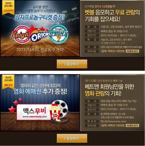 국민체육진흥공단(www.kspo.or.kr)이 발행하는 체육진흥투표권 수탁사업자인 스포츠토토의 공식 온라인 발매 사이트 베트맨(www.betman.co.kr)이 2013-2014시즌 국내프로농구 KBL 예매권을 제공하는 문화혜택 스포츠 17탄과 영화 포털 맥스무비에서 영화를 예매할 수 있는 예매권을 증정하는 문화혜택 영화2탄 이벤트를 진행한다.