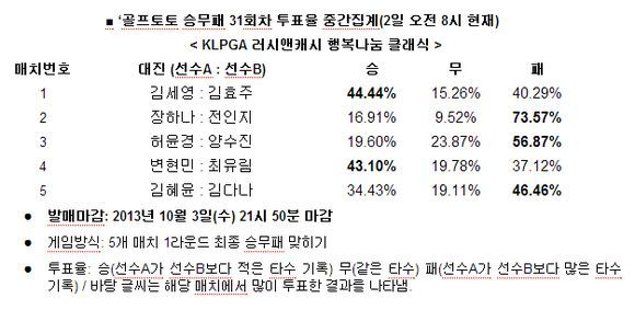 KLPGA 러시앤캐시 행복나눔 클래식 1라운드 대상 골프 승무패 31회차 중간집계 결과