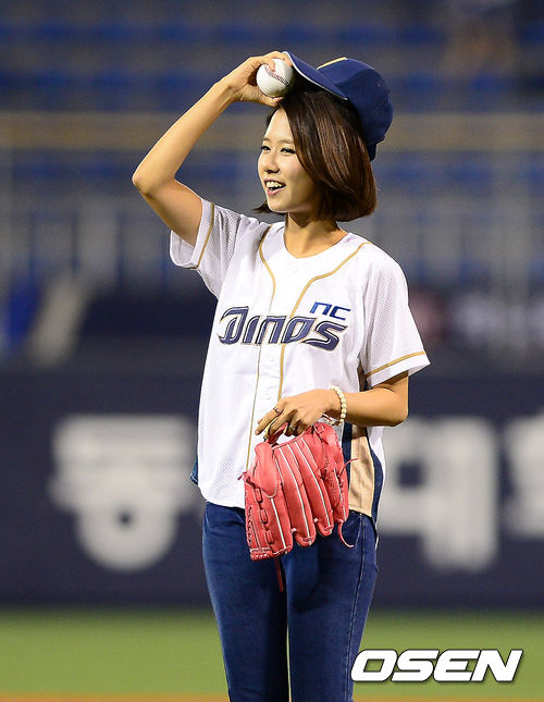 경기에 앞서 시구자로 나선 MBC 경남 이윤선 아나운서가 팬들에 인사를 하고 있다.
