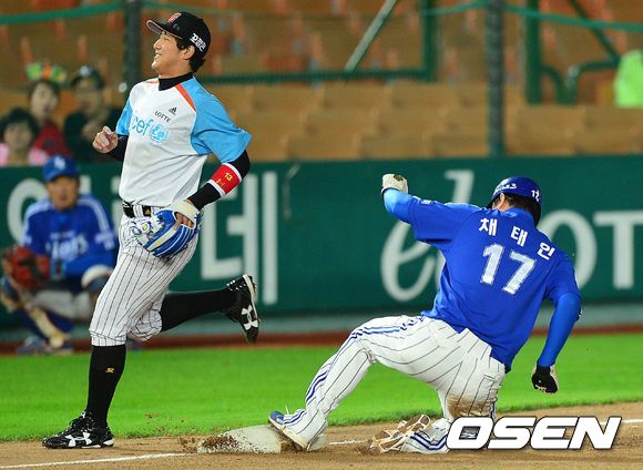2회초 삼성 공격 2사 1, 2루 상황 8번 이지영 타석 때 2루 주자 채태인이 3루 도루에 성공하고 있다. 급하게 백업에 들어가는 롯데 3루수 황재균.