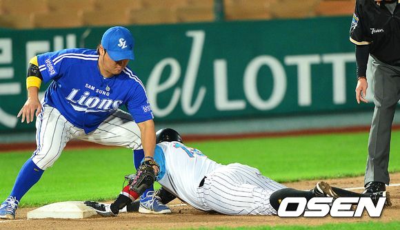 2회말 롯데 공격 2사 2루 상황 7번 조성환 타석 때 2루 주자 황재균이 3루 도루에 성공하고 있다.