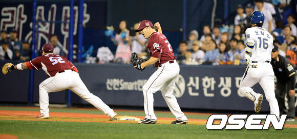 5회말 2사 만루에서 넥센 나이트가 NC 모창민을 2루땅볼로 처리하며 기뻐하고 있다.