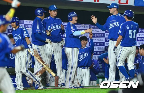 4회초 삼성 공격 1사 만루 상황 7번 정형식의 우익수 플라이 때 홈을 밟은 최형우가 더그아웃으로 들어오는 정형식과 대화를 나누고 있다.