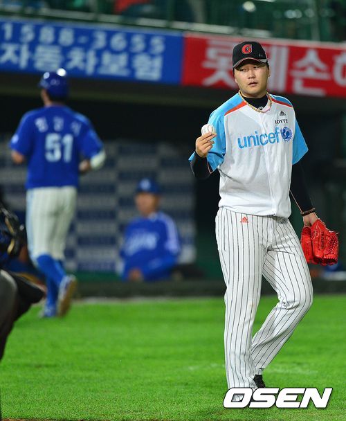 4회초 삼성 공격 1사 만루 상황 7번 정형식의 우익수 희생플라이 때 홈 송구가 빠지며 2실점한 롯데 선발 이상화가 공을 받아든 뒤 아쉬워하고 있다.