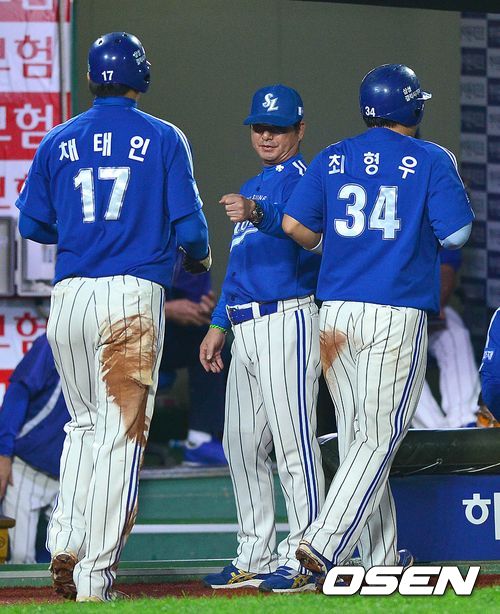 4회초 삼성 공격 1사 만루 상황 7번 정형식의 우익수 희생플라이 때 홈 송구가 빠지며 득점에 성공한 최형우와 채태인이 류중일 감독과 인사를 나누고 있다.