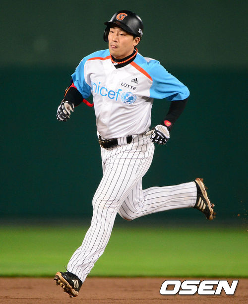 6회말 무사 1루에서 롯데 손아섭이 좌월 투런 홈런을 치고 그라운드를 돌고 있다.