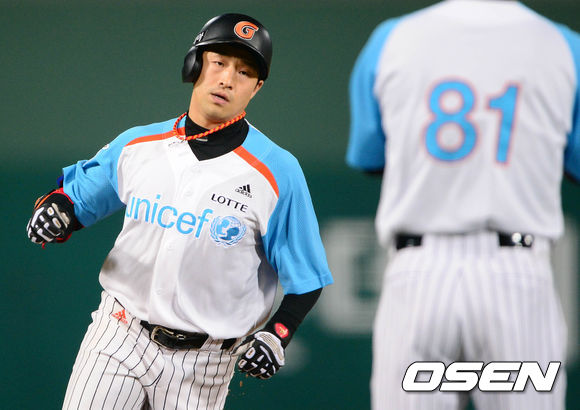 6회말 무사 1루에서 롯데 손아섭이 좌월 투런 홈런을 치고 그라운드를 돌고 있다.