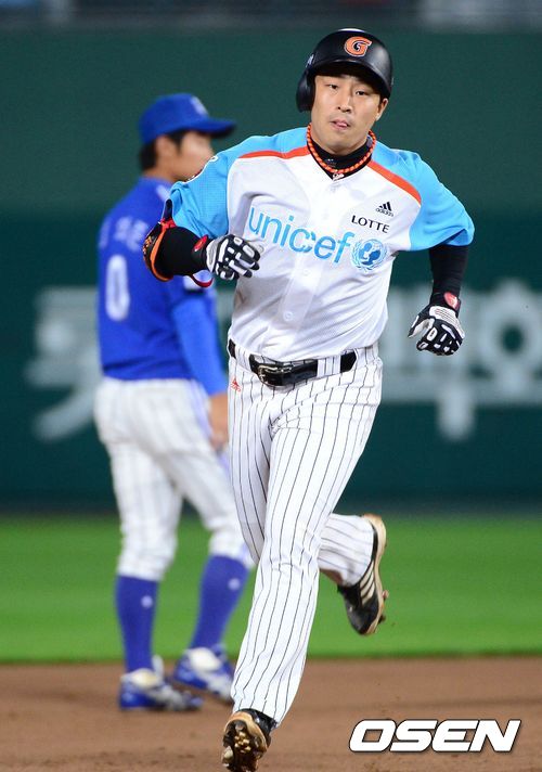 2일 오후 부산 사직구장에서 '2013 한국야쿠르트 세븐 프로야구' 롯데 자이언츠 대 삼성 라이온즈의 경기 6회말 무사 1루 손아섭이 좌월 투런 홈런을 치고 베이스를 돌고 있다.