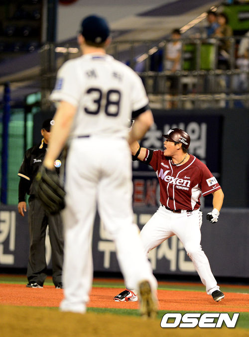 9회초 2사 3루에서 넥센 이성열이 1타점 중전 적시타를 날리고 기뻐하고 있다.