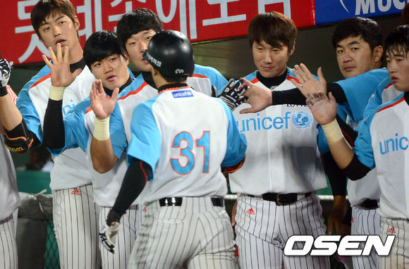 6회말 무사 1루에서 롯데 손아섭이 좌월 투런 홈런을 치고 더그아웃에서 동료들과 하이파이브를 하고 있다.