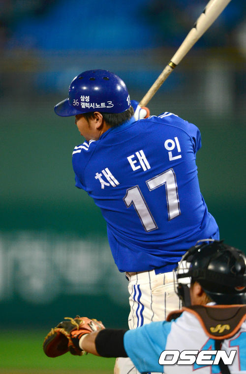 7회초 2사 1,2루에서 삼성 채태인이 좌전 적시타를 치고 있다.