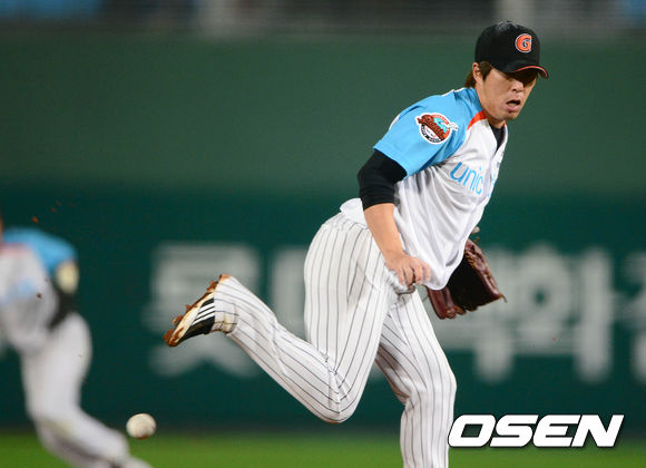 7회초 2사 2,3루에서 롯데 김승회가 삼성 성의준의 타구를 발로 막으려 하고 있다.