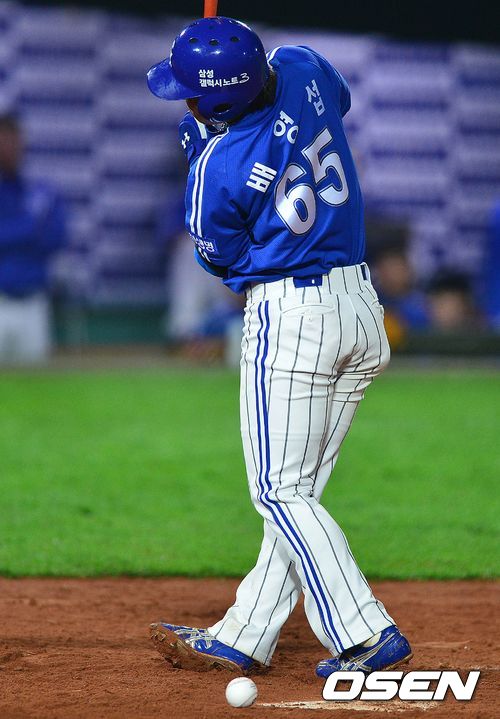 8회초 삼성 공격 2사 3루 상황 1번 배영섭이 롯데 투수 허준혁의 투구에 옆구리를 맞고 괴로워하고 있다.