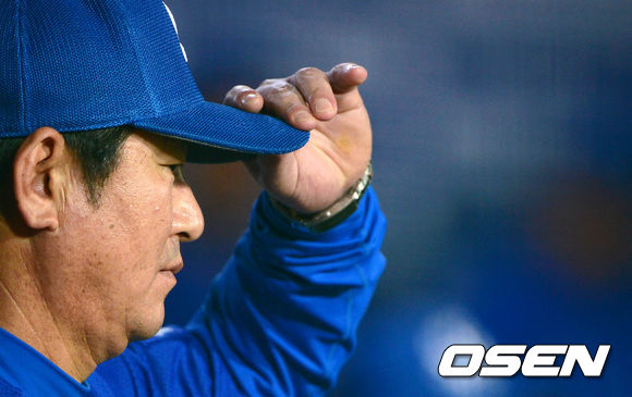 9회말 삼성 류중일 감독이 더그아웃에서 경기를 바라보고 있다.