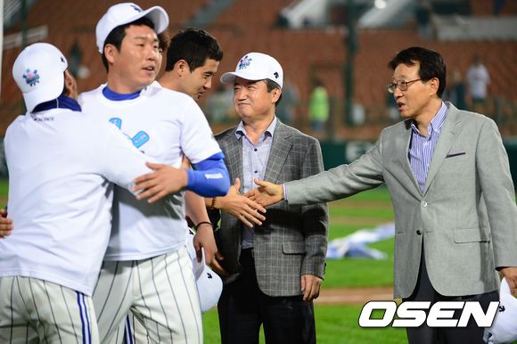 김인 사장(오른쪽)과 송삼봉 단장이 우승을 차지한 선수들을 격려하고 있다./spjj@osen.co.kr