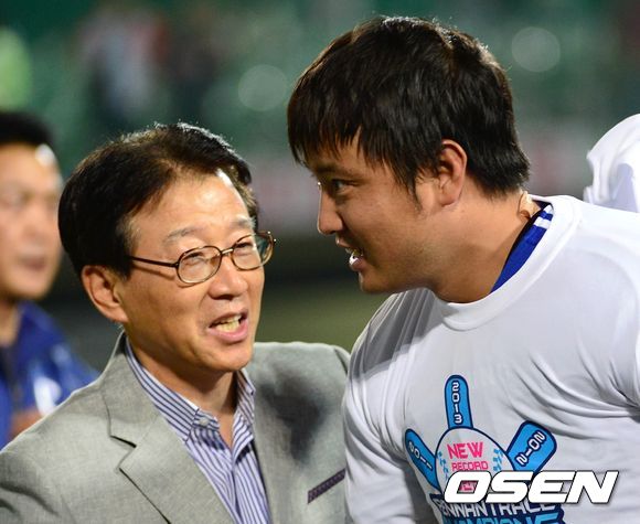 삼성 김인 사장이 채태인 선수를 격려하고 있다./spjj@osen.co.kr