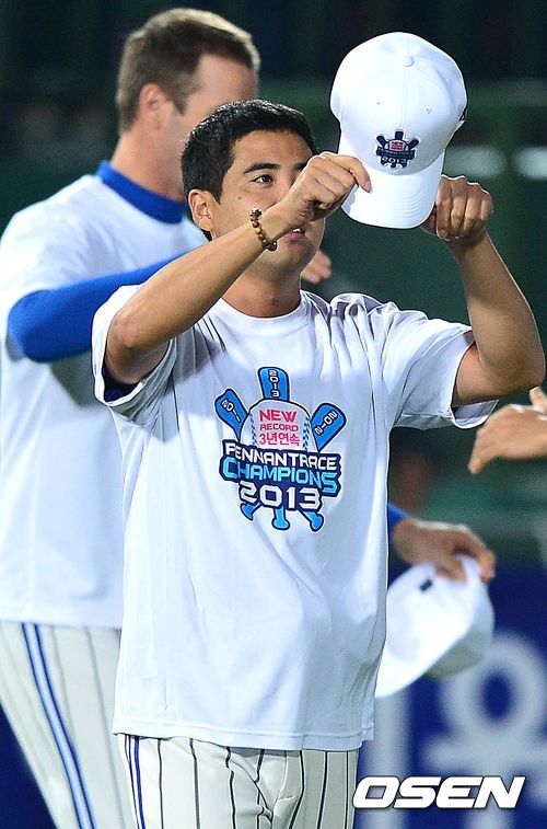삼성 장원삼이 우승 모자를 들고 기념촬영을 하기 위해 그라운드로 나서고 있다./dreamer@osen.co.kr
