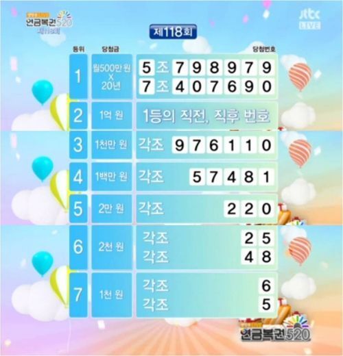 지난 2일 JTBC를 통해 생방송으로 진행된 연금복권520 추첨에서 118회 당첨번호는 5조 798979, 7조 407690이 선정됐다.
