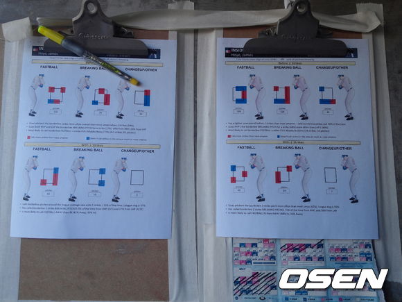 류현진(LA 다저스)이 시즌 14승을 따냈던 지난달 25일(이하 한국시간) 샌프란시스코 자이언츠전을 앞둔 AT&T 파크 다저스 더그아웃에는 어김없이 구심의 스트라이크 존 분석자료가 붙어 있었다. 류현진은 "(그 자료를) 크게 신경쓰지 않고 던졌다"고 답했지만 포수인 A.J. 엘리스는 달랐다. 클럽하우스에는 전력분석을 위한 컴퓨터가 4~5대 가량 비치되어 있는데, 엘리스는 경기 전 구심의 스트라이크 존 분석자료를 보면서 볼배합을 연구하는데 바빴다.