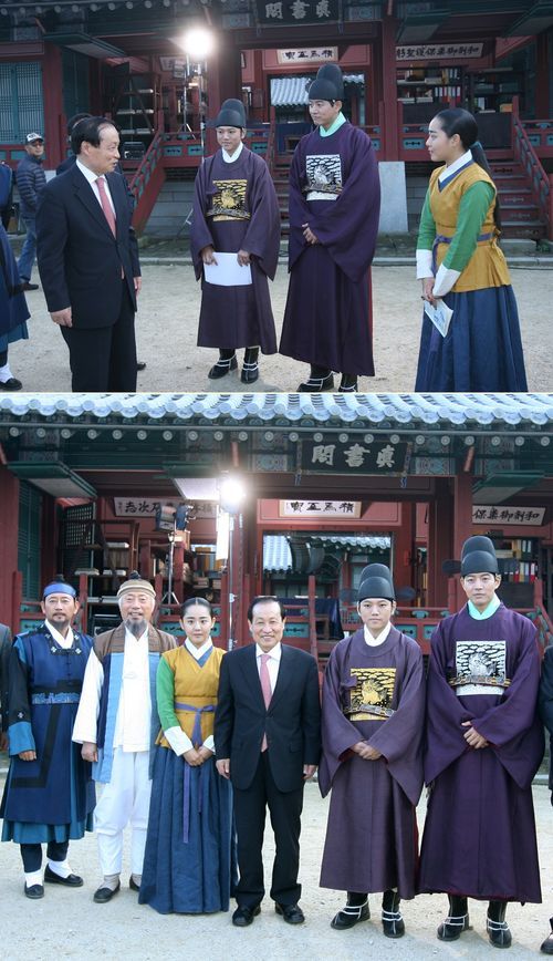 이경재 방송통신위원장이 ‘불의 여신 정이’ 이상윤 문근영 등 출연진과 이야기를 나누고 있다. 아래 사진은 출연진과 함께 찍은 기념 컷. /방통위 제공.
