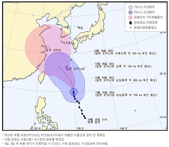 한편 제23호 태풍 피토(FITOW)는 미크로네시아에서 제출한 이름으로 꽃의 한 종류이다. 다음 정보는 3일 오후 4시경 발표될 예정이며 4일, 5일 후 태풍 위치가 유동적일 수 있다.