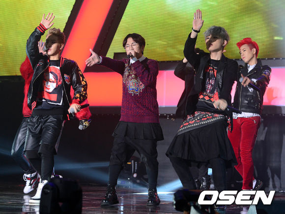 블락비가 3일 오후 서울 안암동 고려대학교 화정체육관에서 열린 기자간담회에서 공연을 펼치고 있다.