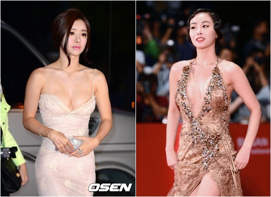 그 때문일까. 두 사람은 약속이라도 한듯 과감하고 섹시한 드레스로 시선을 모았다. 먼저 홍수아는 누드톤의 핑크빛 롱 드레스로 묘한 섹시미를 드러냈다. 그 가운데서도 가슴의 절반 가량을 드러낸 파격적인 자태가 남성팬들의 눈길을 사로잡은 것. 평소 베이글녀로 사랑받던 그는 기대를 저버리지 않는 동안 미모에 건강하고 육감적인 몸매를 그대로 드러냈다.
