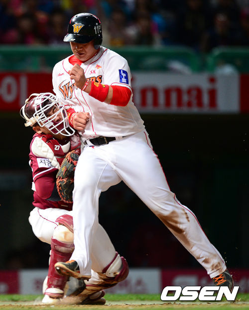 3일 오후 인천 문학구장에서 열린 '2013 한국야쿠르트 세븐 프로야구' SK 와이번스와 넥센 히어로즈의 경기, 5회말 2사 2루 SK 정상호가 최윤석의 안타때 홈으로 쇄도하다 넥센 허도환과 충돌하고 있다.