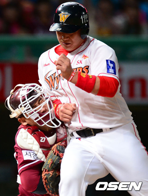 3일 오후 인천 문학구장에서 열린 '2013 한국야쿠르트 세븐 프로야구' SK 와이번스와 넥센 히어로즈의 경기, 5회말 2사 2루 SK 정상호가 최윤석의 안타때 홈으로 쇄도하다 넥센 허도환과 충돌하고 있다.