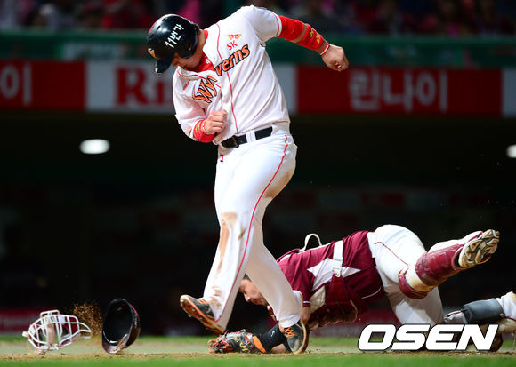 3일 오후 인천 문학구장에서 열린 '2013 한국야쿠르트 세븐 프로야구' SK 와이번스와 넥센 히어로즈의 경기, 5회말 2사 2루 SK 정상호가 최윤석의 안타때 홈으로 쇄도하다 넥센 허도환과 충돌하고 있다.