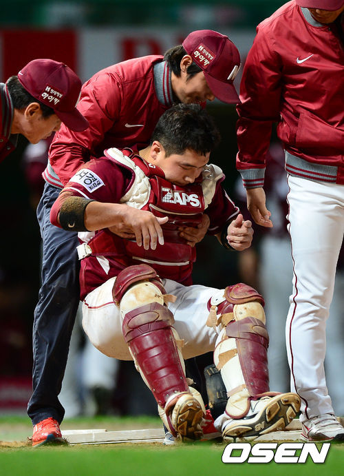 3일 오후 인천 문학구장에서 열린 '2013 한국야쿠르트 세븐 프로야구' SK 와이번스와 넥센 히어로즈의 경기, 5회말 2사 2루 넥센 허도환이 최윤석의 안타때 홈으로 쇄도하던 정상호와 충돌한 뒤 고통스러워 하고 있다.