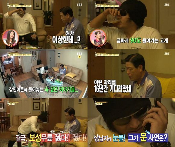 그러나 그는 방송 말미 장인과 함께 술을 마시는 자리에서 갑작스럽게 눈물을 보였고, 급기야 무릎을 꿇고 부인에게 전화를 걸기까지했다. 김보성이 눈물을 흘렸던 자세한 이유는 다음주 방송에서 공개될 예정이다.