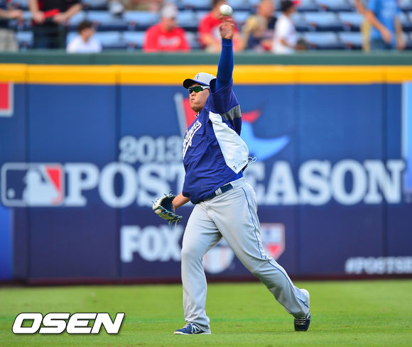 4일 (이하 한국시간) 미국 조지아 애틀랜타 터너필드에서 열린 2013 메이저리그 애틀랜타 브레이브스와 LA 다저스의 내셔널리그 디비전시리즈(5전3선승제) 1차전, 경기 전 다저스 류현진이 피칭 훈련을 하고 있다.