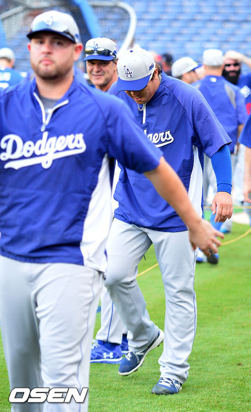 4일 (이하 한국시간) 미국 조지아 애틀랜타 터너필드에서 열린 2013 메이저리그 애틀랜타 브레이브스와 LA 다저스의 내셔널리그 디비전시리즈(5전3선승제) 1차전, 경기 전 다저스 훈련시간에 돈 매팅리 감독의 유머넘치는 응원에 류현진이 웃고 있다.