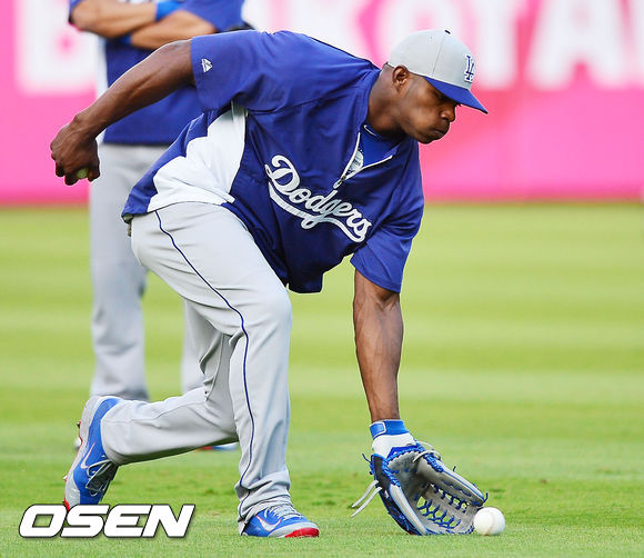 4일 (이하 한국시간) 미국 조지아 애틀랜타 터너필드에서 열린 2013 메이저리그 애틀랜타 브레이브스와 LA 다저스의 내셔널리그 디비전시리즈(5전3선승제) 1차전, 경기 전 다저스 훈련시간에 야시엘 푸이그가 수비훈련을 하고 있다.