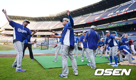 4일 (이하 한국시간) 미국 조지아 애틀랜타 터너필드에서 열린 2013 메이저리그 애틀랜타 브레이브스와 LA 다저스의 내셔널리그 디비전시리즈(5전3선승제) 1차전, 경기 전 다저스 훈련시간에 류현진이 몸을 풀고 있다.