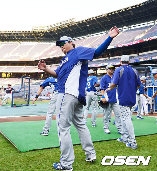 4일 (이하 한국시간) 미국 조지아 애틀랜타 터너필드에서 열린 2013 메이저리그 애틀랜타 브레이브스와 LA 다저스의 내셔널리그 디비전시리즈(5전3선승제) 1차전, 경기 전 다저스 훈련시간에 류현진이 몸을 풀고 있다.