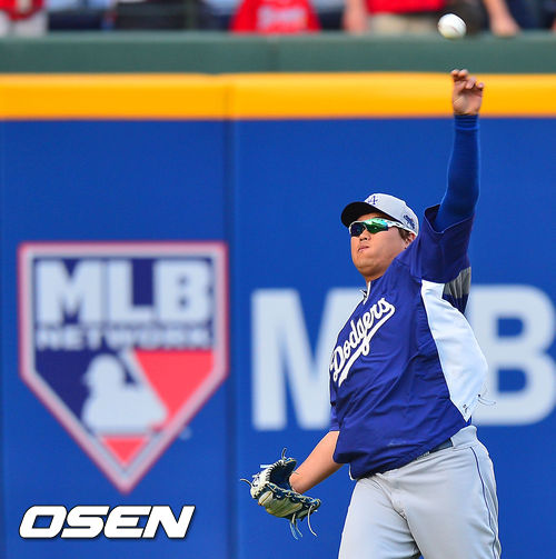 4일 (이하 한국시간) 미국 조지아 애틀랜타 터너필드에서 열린 2013 메이저리그 애틀랜타 브레이브스와 LA 다저스의 내셔널리그 디비전시리즈(5전3선승제) 1차전, 경기 전 다저스 훈련시간에 류현진이 힘차게 공을 뿌리고 있다.