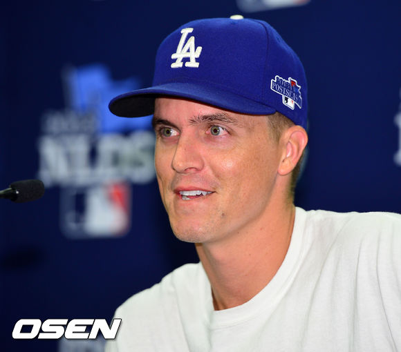 4일 (이하 한국시간) 미국 조지아 애틀랜타 터너필드에서 열린 2013 메이저리그 애틀랜타 브레이브스와 LA 다저스의 내셔널리그 디비전시리즈(5전3선승제) 1차전, 경기 전 다저스 잭 그레인키가 인터뷰 중 미소짓고 있다.