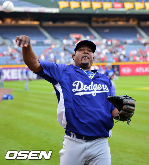 4일 (이하 한국시간) 미국 조지아 애틀랜타 터너필드에서 열린 2013 메이저리그 애틀랜타 브레이브스와 LA 다저스의 내셔널리그 디비전시리즈(5전3선승제) 1차전, 경기 전 다저스 유리베가 피칭 훈련을 하고 있다.